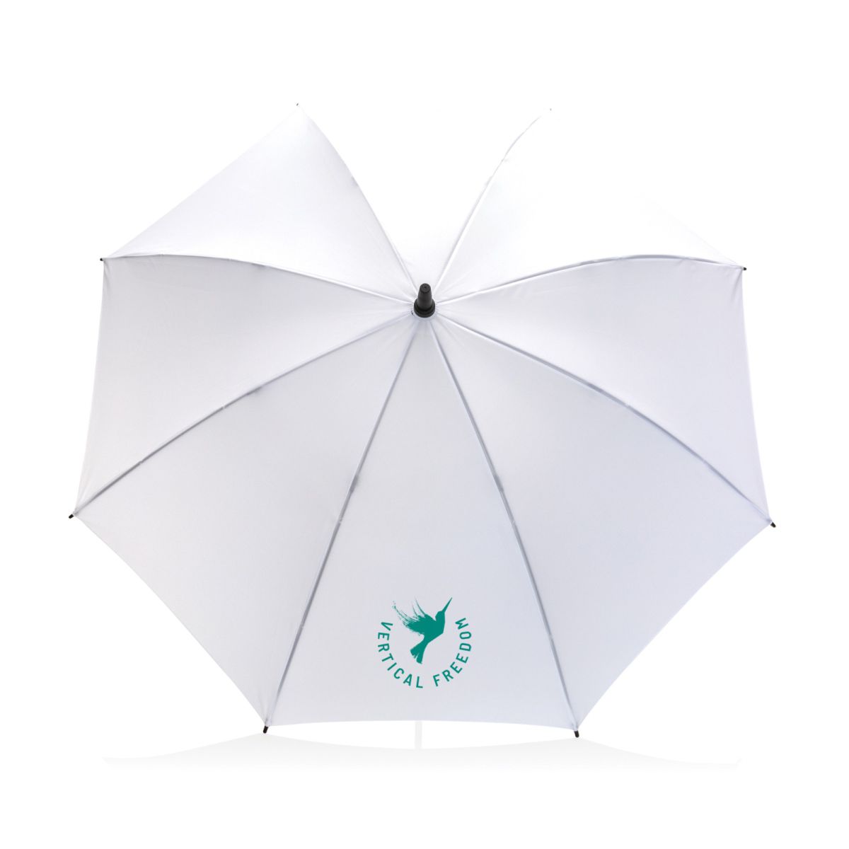 Umbrela Impact, de culoare albă, este fabricată din material reciclat RPET 190T cu tehnologia AWARE™.